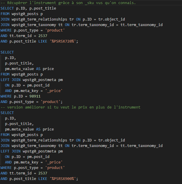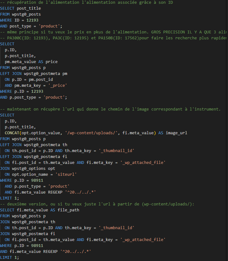 J’ai travaillé sur l’extraction de données depuis des bases SQL et PostgreSQL. J’ai réalisé plusieurs tests en ligne de commande afin de comprendre comment récupérer correctement les informations produits.